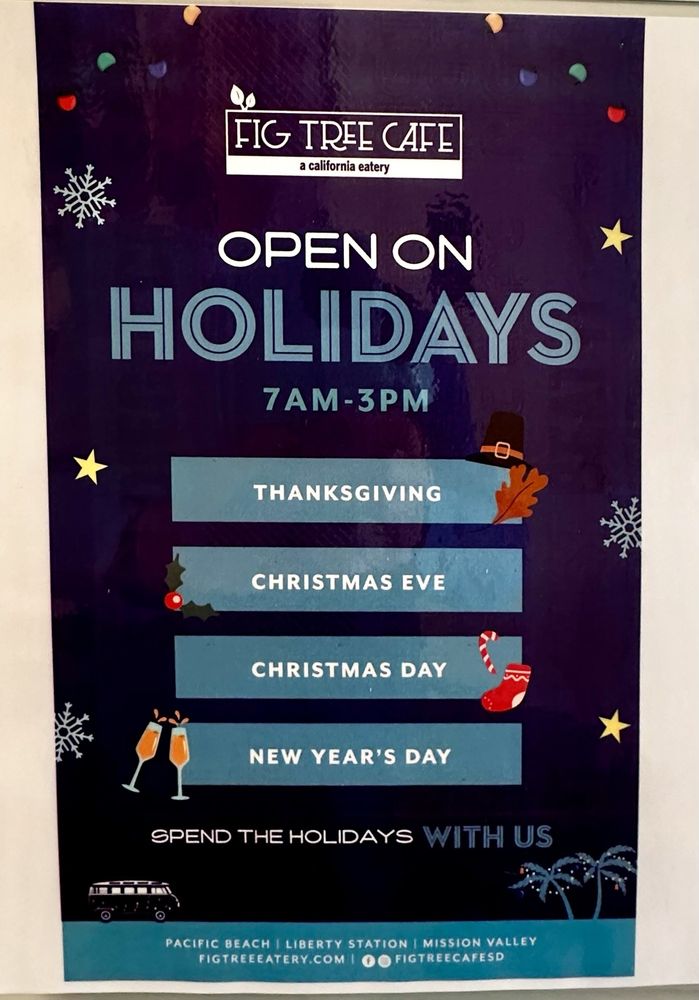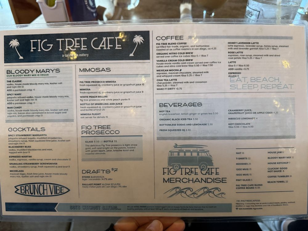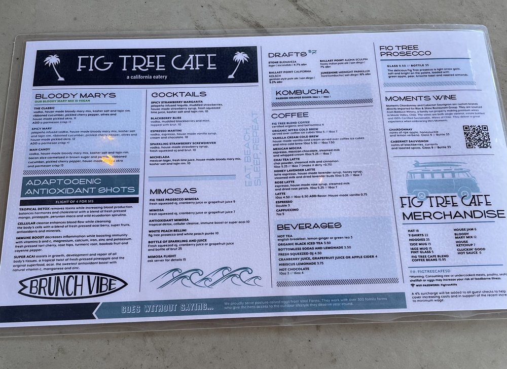 Fig Tree Cafe is a charming eatery in Pacific Beach, CA, offering a diverse menu of New American cuisine with a focus on sandwiches, breakfast, and brunch. This inclusive establishment caters to a wide range of dietary preferences, including vegan and vegetarian options. The cafe provides various utilities such as delivery, takeout, reservations, and even accepts cryptocurrency as payment. The relaxed atmosphere, complete with outdoor seating and a full bar, makes it an ideal spot for groups, families, and even furry friends. The menu boasts innovative dishes like Breakfast Sushi, California Breakfast Burrito, and Crispy Pork Belly & Grits. Customers praise the flavorful offerings, from the House-cured Salmon Benedict to the traditional Benedict, all served with precision and care. The positive reviews highlight the excellent service and friendly staff, making Fig Tree Cafe a must-visit destination for a delightful dining experience.